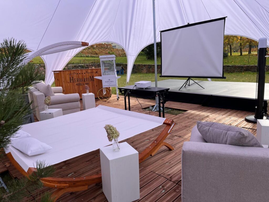 Zapraszamy do strefy, gdzie kino spotyka luksus. Wygodne leżanki i miękkie kanapy czekają w samym sercu parku, a świeży popcorn z retro maszyny robi robotę już od pierwszego zapachu. Zachód słońca, zieleń dookoła i duży ekran pod chmurką — prosto, elegancko.